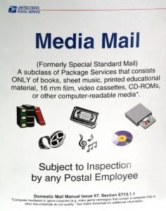 Make sure to label the packaging with “Media Mail” on the front. Do not seal any of the packaging until you’ve reached the post office. Since Media Mail is subject to search due to the discounted pricing, postal workers may be required to examine the contents of your package.